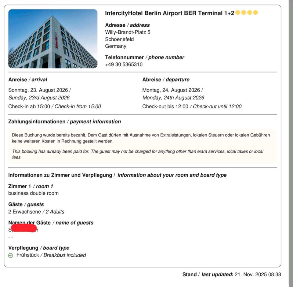Hotelübernachtung Intercity Berlin Airport 23.08.2026